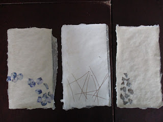 The photo at top shows a few small pieces of cotton paper (about 8" square) that we made the first evening we were there. The piece on the left is plain; the second was scrunched up and then smoothed out, to get some texture; the third had a bamboo placemat pressed into it for texture.